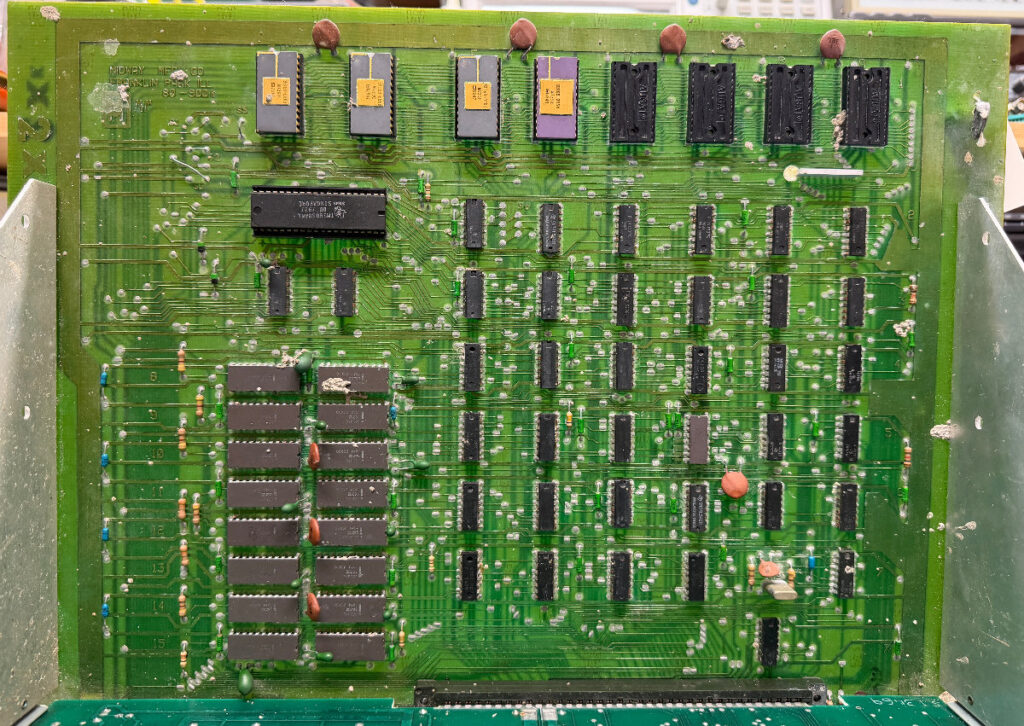 MPU-board had acid damage as they usually have. A bit of cleaning together with vinegar hopefully prolongs the boards life. There were many chips on the board that was bad and had to be replaced before it booted again. (CPU/PIA/5101/6810) A new battery holder were placed in the backbox. Reflowed the connectors.